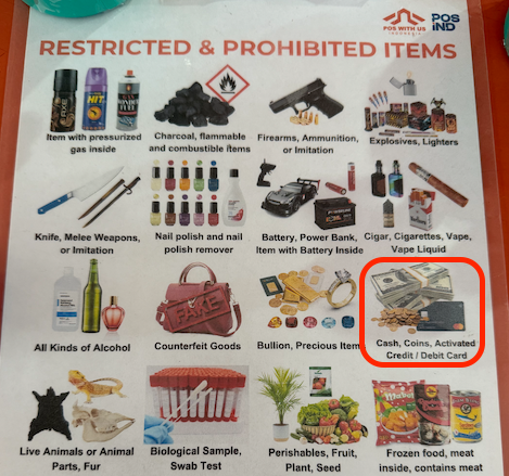 原因: インドネシアの郵便局は現在、カード・現金類の受け取りが制限されています。2025年時点のインドネシア郵便局のカウンターには「現金・カード類は受け取り不可」の掲示がありました。