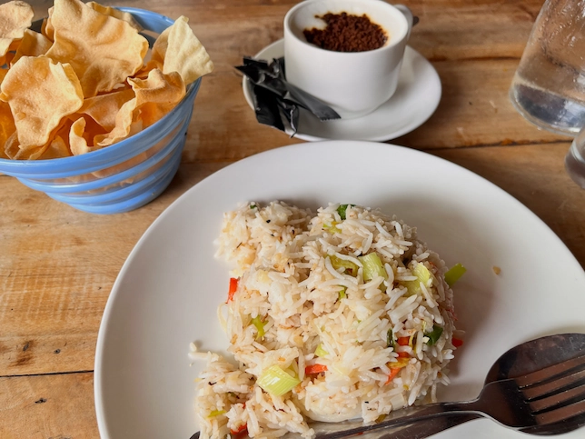 Ocean Way Guraidhooのすぐ近くにある割と安価なカフェ。オーナーおすすめのお店です。食事前に提供される左側のスナック(パパド) が美味しくて、ついパリパリ食べてしまいます。