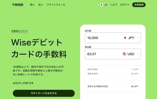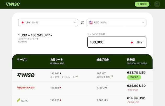 - Wise:為替マージンなし、手数料は明示された送金手数料のみ