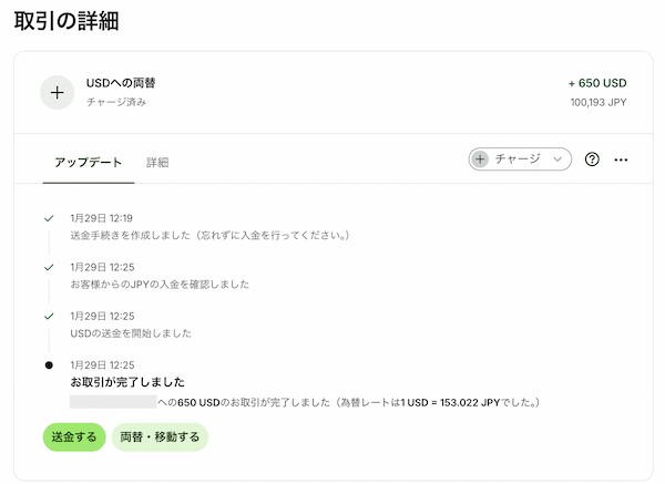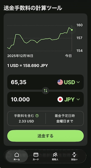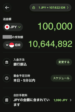 - 金額を入力:送金したい金額を入力すると、その瞬間のレートと手数料(固定手数料+変動手数料)が詳細に表示されます。(写真参照)