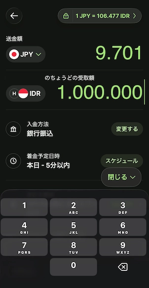 - ポイント:送金ボタンを押さなくても、通貨ペア(例:日本円 JPY → インドネシアルピア IDR)を入力するだけで、リアルタイムのレートと手数料がすぐに表示されます。