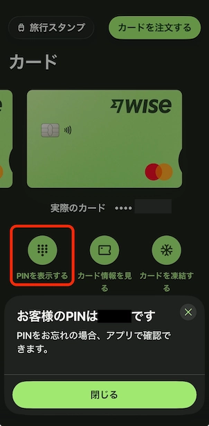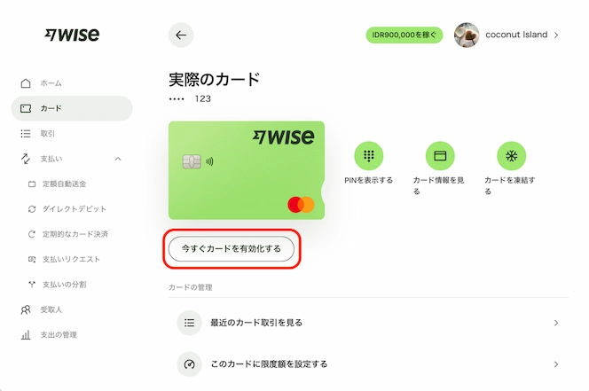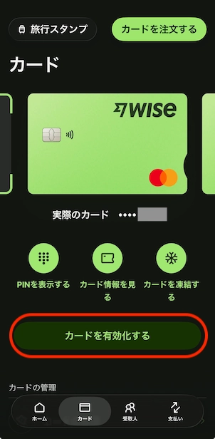 日本で発行されたWiseカードは、カード到着時に同梱されている6桁のPINコードを使って有効化します。