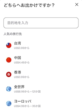 「目的地を検索」の欄に、渡航先の国名を入力します。