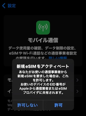「新規のeSIMをアクティベートしますか?」と表示されます。