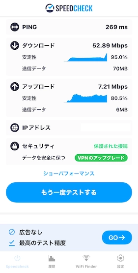 ⚠️ 注意:スピードテストはデータを大量消費します 私は1回のスピードテスト(Speedcheck)で約420MB消費しました。 3GBプランだと、1回で約14%減ります。