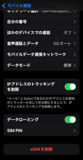 これがOFFだと、データローミングの項目すら表示されません。 - 2. データローミングがONか